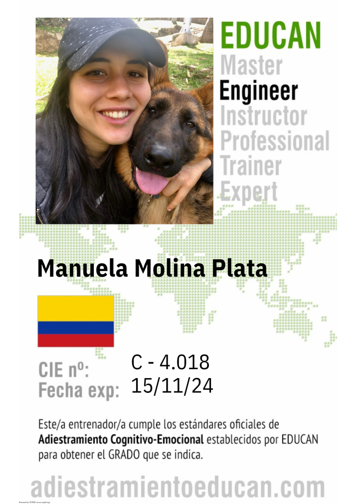 Professional Dog Trainer, certified by EDUCAN in Spain. Over 350 hours of various courses between Spain, Argentina, and Colombia.